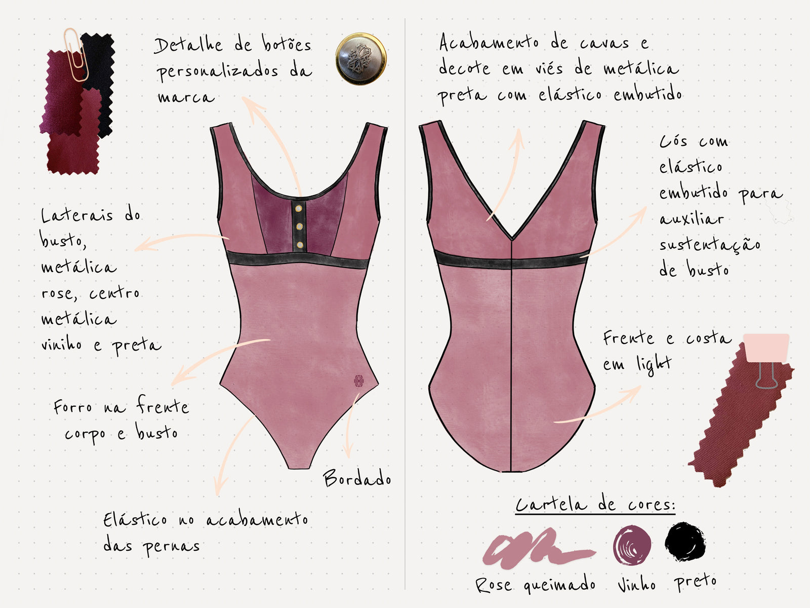Os recortes verticais no busto, além de estratégico para acomodar melhor os seios, também possibilitam criar uma dinâmica de cores e tecidos, deixando o collant com ar mais moderno.
