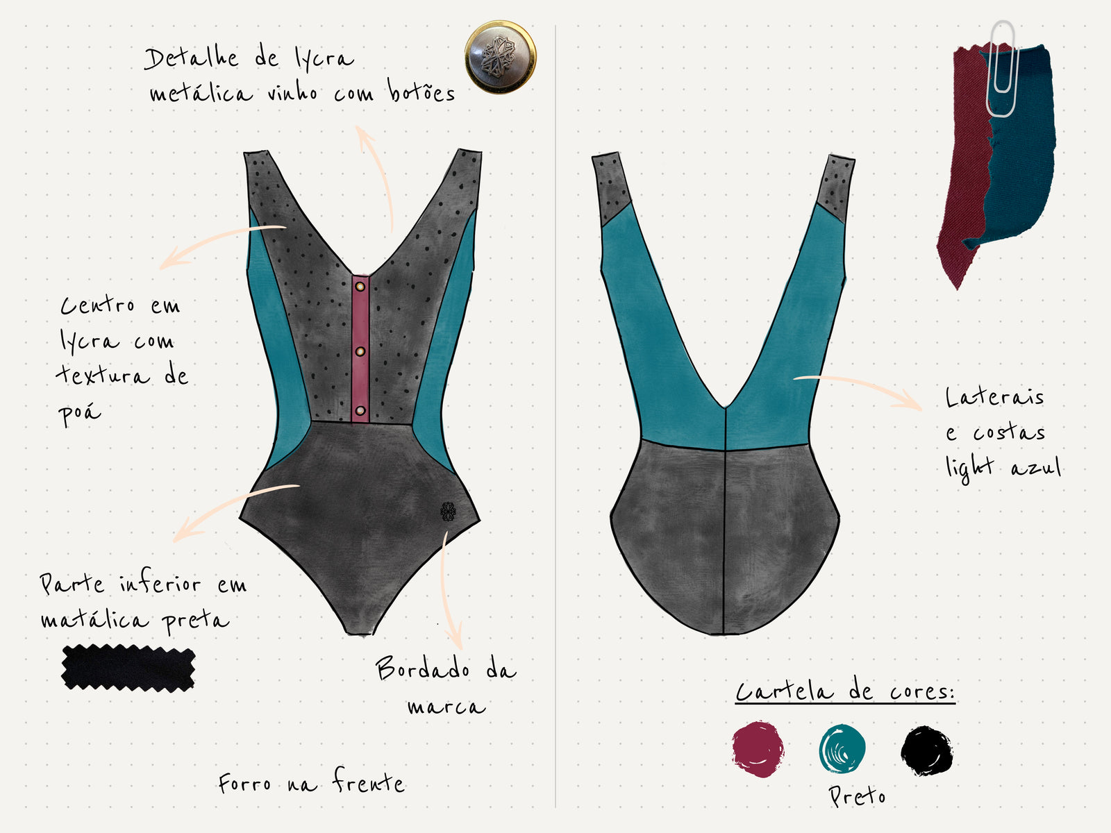 Em uma mistura de light, lycra metálica e lycra de poá, a peça une cor, estrutura e presença, onde cada detalhe soma ao todo.