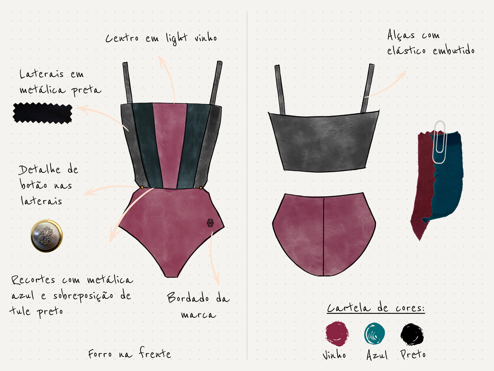Em uma composição de light, lycra metálica e detalhes com sobreposição de tule, mistura o preto, azul e vinho, criando um visual de profundidade e dinamismo.
