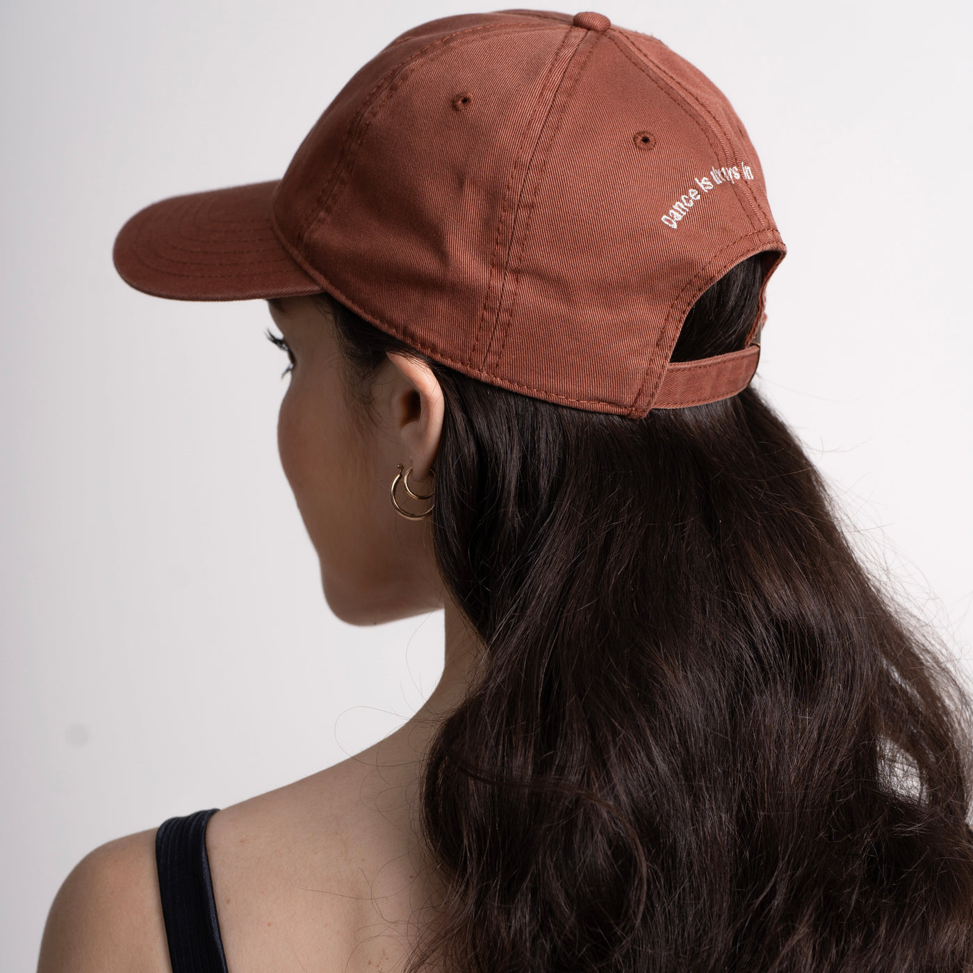 Boné terracota 100% algodão, com bordado de logo na frente e frase “dance is always in my mind” atrás “.