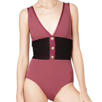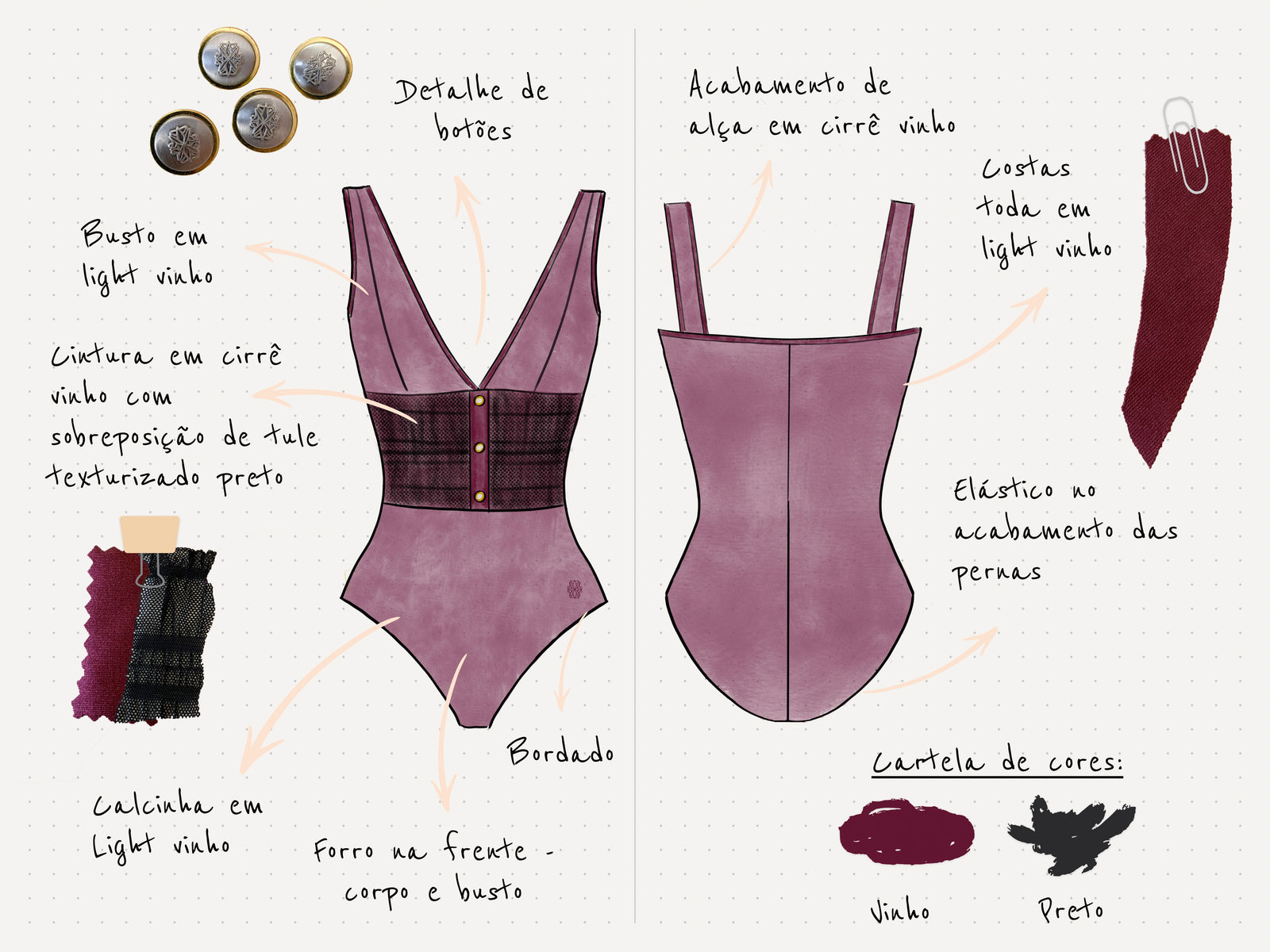 Todo em light vinho, com lycra metálica em lugares pontuais, a região da cintura se destaca, não só pelo contraste de cor do tule, como também pelo diferencial de textura e detalhe dos botões.